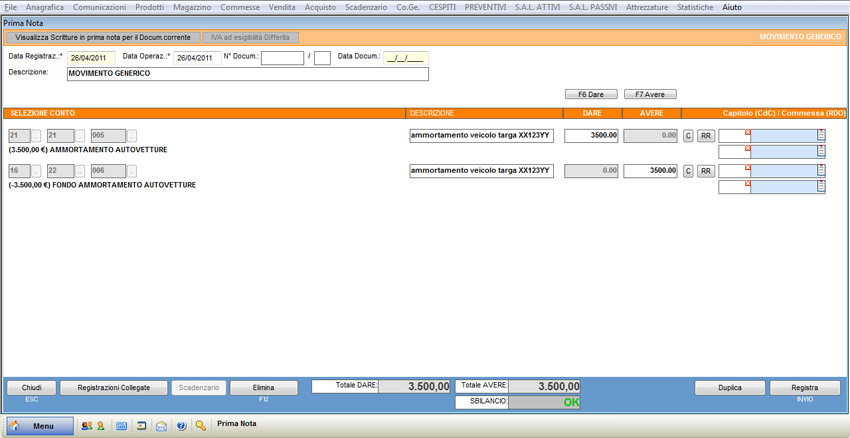 Si supponga di registrare la quota di ammortamento di un’autoveicolo per un importo di 3.500 €.
