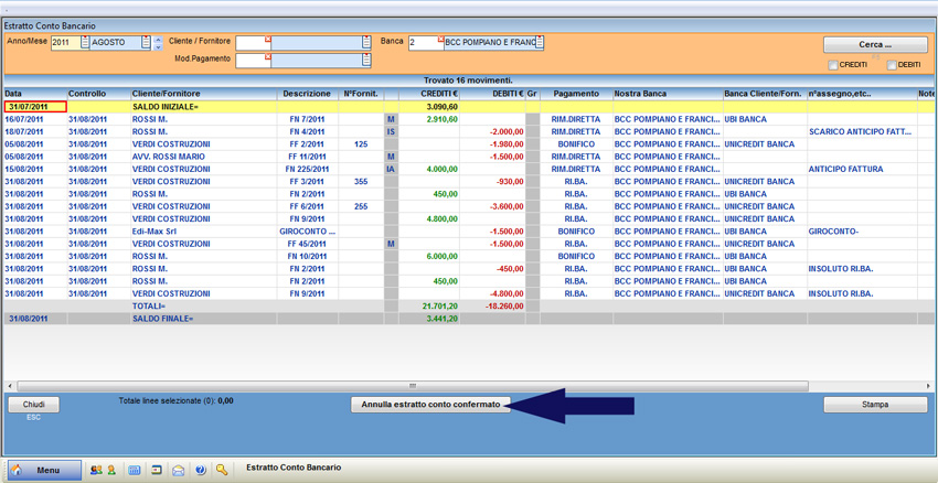 Per annullare l’estratto conto bancario selezionare il pulsante “Annulla Estratto Conto Confermato”.