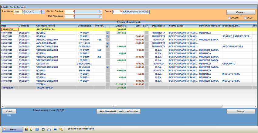 Ogni linea corrisponde ad un movimento bancario ed è composta da colonne che ne descrivono la data del movimento, la data della spunta (conferma), il cliente o fornitore, la descrizione del documento, l’importo del credito, l’importo del debito, la tipologia di pagamento, la banca dell’azienda, la banca del cliente/fornitore, il numero assegno o eventuali altre indicazioni relative al pagamento.