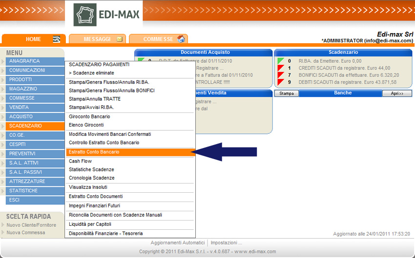 Per visualizzare l’estratto conto bancario, dal menu principale selezionare la voce “Scadenzario” e “Estratto Conto Bancario”.