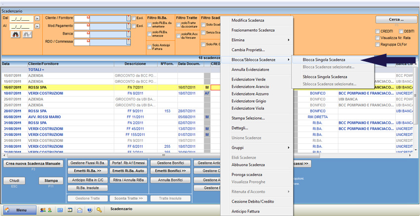 La funzione “Blocca/Sblocca Scadenza” consente di bloccare una scadenza in modo da non poter essere utilizzata all’interno dello scadenzario.