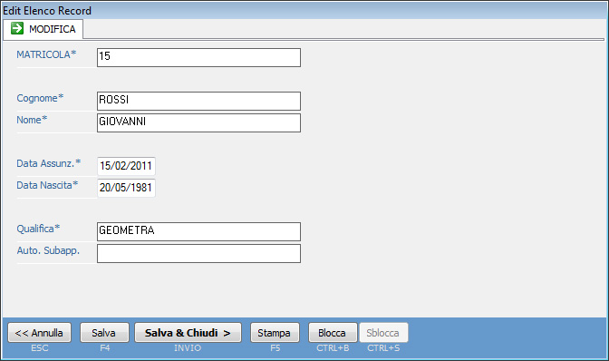 Premere il pulsante “Nuovo” o il tasto F3 per creare il cartellino per un nuovo dipendente e digitare all’interno dei campi corrispondenti i dati di seguito descritti (i campi contrassegnati con “*” sono obbligatori):