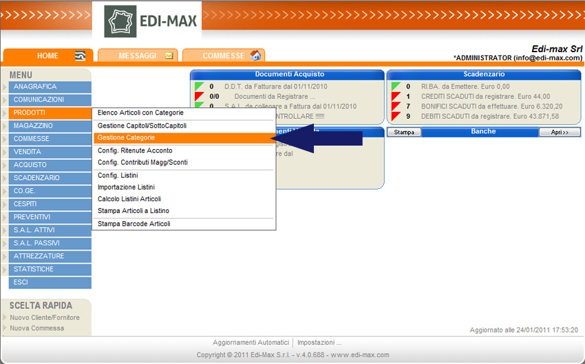 Edi-Max consente di tenere un elenco di categorie da poter utilizzare nelle diverse operazioni relative all’azienda. Per inserire una nuova categoria, dal menu principale selezionare “Prodotti” e “Gestione Categorie”. Viene visualizzato l’elenco delle categorie precedentemente inserite; per crearne una nuova, premere il pulsante “Nuovo” nella parte inferiore della schermata.