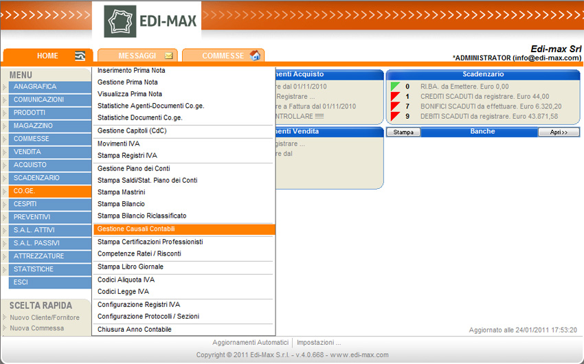 Per creare una causale contabile, dal menu principale selezionare “Co.Ge.” e “Gestione Causali Contabili”.