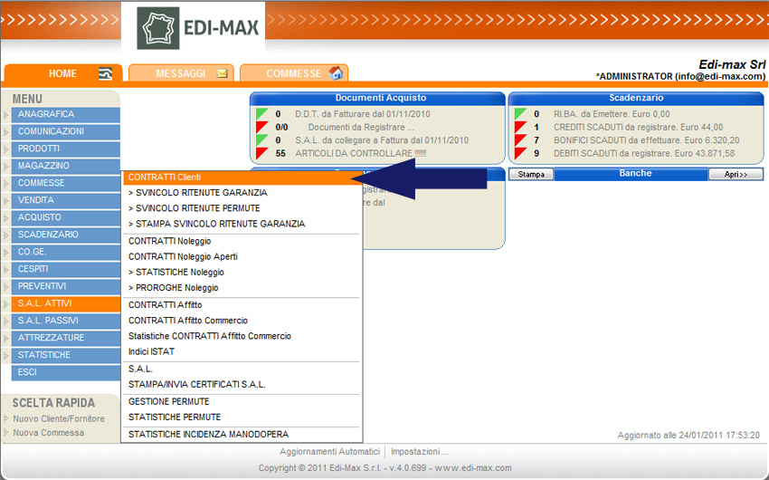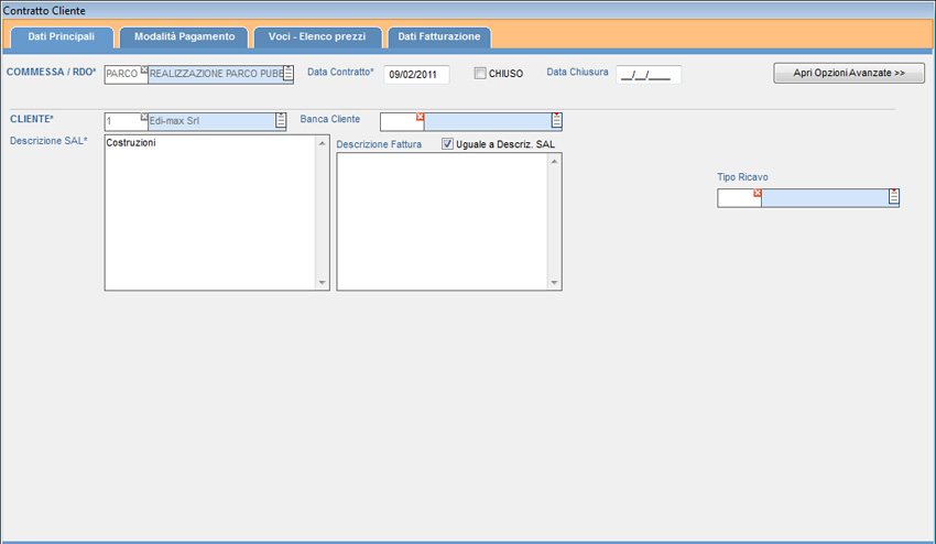 Per inserire un contratto di vendita, dal menu principale selezionare la voce “S.A.L. Attivi” e “Contratti Clienti”. Viene visualizzato l’elenco dei contratti precedentemente inseriti; per inserire un nuovo contratto premere il pulsante “Nuovo” o il tasto F3 e compilare i campi caratterizzanti il contratto suddivisi in quattro sezioni di seguito descritte.