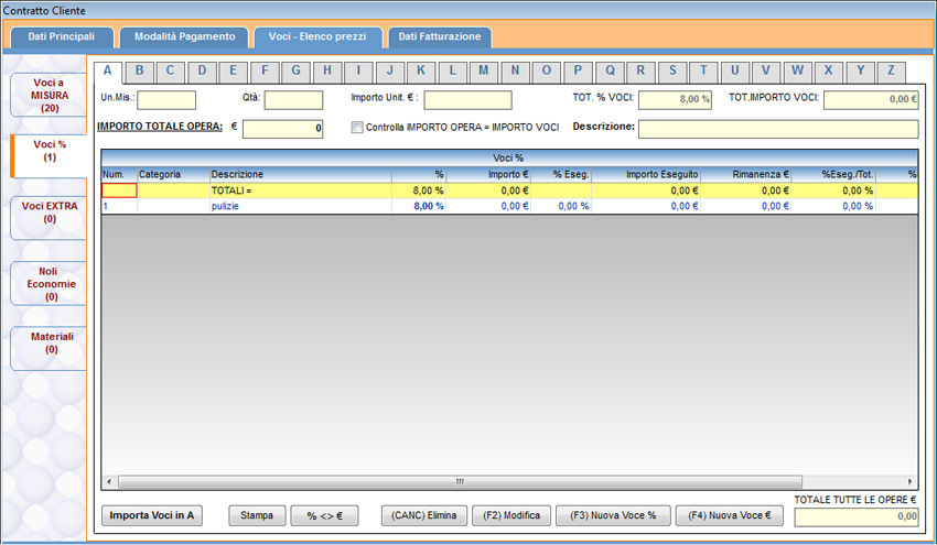 Per creare le voci a corpo, selezionare la finestra “Voci %” e scegliere una delle 26 lettere riportate nella parte superiore della finestra, una per ogni lavoro a forfait composto da più voci a percentuale. Per prima cosa bisogna compilare i campi che descrivono i parametri principali che sono presenti nella parte superiore della schermata: