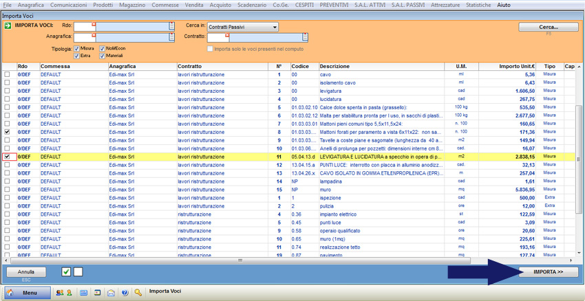 Selezionare le voci da copiare mediante il checkbox corrispondente e confermare l’operazione con il pulsante “IMPORTA” (il software importa le voci selezionate e il valore attribuitegli). Apportare eventuali modifiche alle voci importate e tornare all’elenco voci con il pulsante “Salva”.
