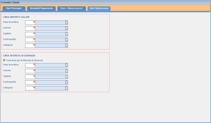 Nella schermata “Dati Fatturazione” è possibile compilare i campi necessari alla fatturazione, come ad esempio l’inserimento in fattura di una linea per la ritenuta di garanzia (selezionare il relativo checkbox) oppure la contropartita (F1 per la ricerca).