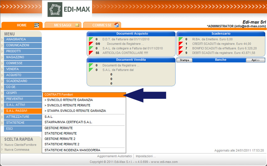 Per inserire un contratto fornitore dal menu principale selezionare la voce “S.A.L. Passivi” e “Contratti Fornitori”; viene visualizzato l’elenco dei contratti precedentemente inseriti. Per crearne uno nuovo premere il pulsante “Nuovo” o il tasto F3 e compilare i campi caratterizzanti il contratto suddivisi in quattro sezioni di seguito descritte.