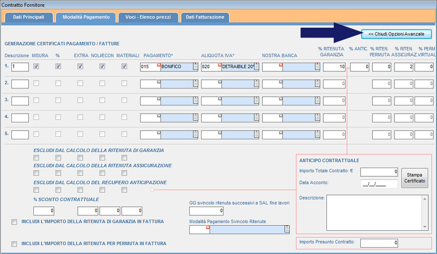 Nel caso di anticipo contrattuale è possibile inserire l’importo, la data dell’acconto e un’eventuale descrizione.