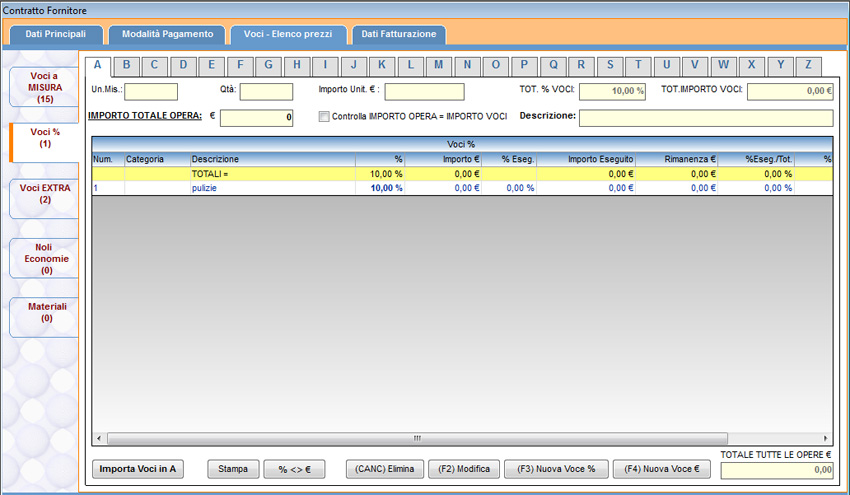 Per creare delle voci a corpo, nella sezione “Voci %”, selezionare una delle 26 lettere riportate nella parte superiore della finestra, una per ogni lavoro a forfait composto da più voci a percentuale.