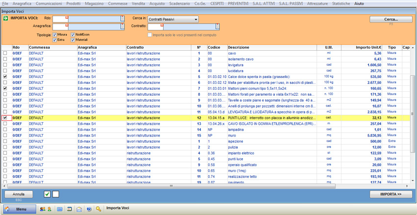 Per importare una o più voci da contratti, computi o preventivi premere il pulsante “Importa Voci”, nella parte inferiore della schermata, al fine di avviare una ricerca filtrata secondo i parametri desiderati compilare i campi sotto riportati: