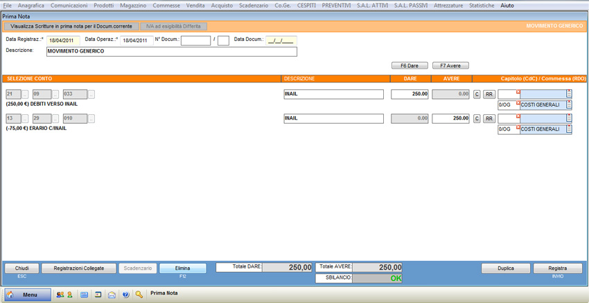 Si supponga di dover registrare il debito nei confronti dell’INAIL per un importo di 250 €.