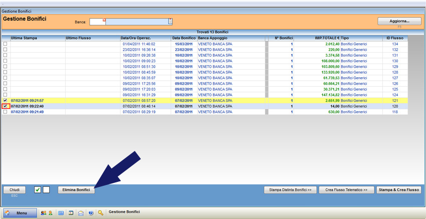 Selezionare i bonifici da eliminare, mediante la spunta del checkbox corrispondente e premere il pulsante “Elimina Bonifici”.