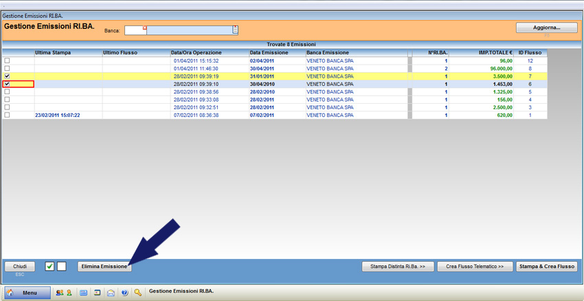 Ogni linea corrisponde ad una Ri.Ba. ed è composta da colonne che ne descrivono la data dell’ultima stampa, la data dell’ultimo flusso, la data e l’ora dell’operazione, la data di emissione della Ri.Ba., la banca di emissione, il numero della Ri.Ba., l’importo totale e il numero dell’ID che identifica il flusso. Selezionare le Ri.Ba. da eliminare, mediante la spunta del checkbox corrispondente e premere il pulsante “Elimina Emissione”.