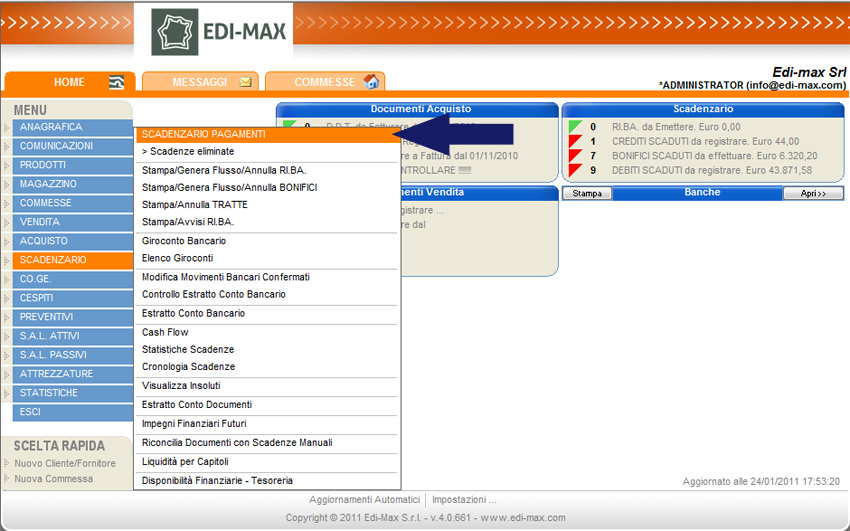 Per eliminare una Ri.Ba. emessa, dal menu principale selezionare la voce “Scadenzario” e “Scadenzario Pagamenti”.
