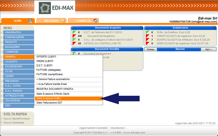 Dal menu principale selezionare “Vendita” e “Stato Evasione Ordini”.