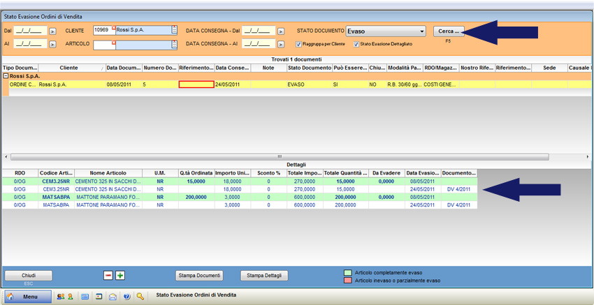 NB: le linee evidenziate di rosso indicano articoli inevasi o parzialmente evasi, mentre le linee evidenziate di verde indicano articoli completamente evasi.