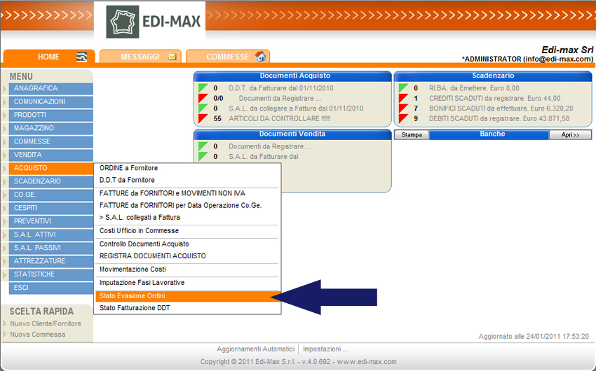 Dal menu principale selezionare “Acquisto” e “Stato Evasione Ordini”.