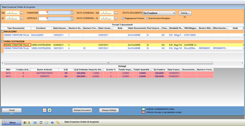 NB: le linee evidenziate di rosso indicano articoli inevasi o parzialmente evasi, mentre le linee evidenziate di verde indicano articoli completamente evasi.