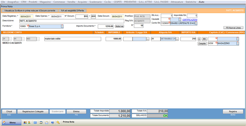 Nella parte superiore della schermata “Prima Nota”, inserire i dati relativi alla fattura: