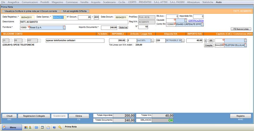 Si supponga di dover registrare spese telefoniche per 200 € con Iva 20% non deducibile al 50% dal fornitore Rossi S.p.A.. Questo è il caso di Iva parzialmente deducibile.