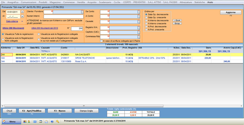 Premere il pulsante “Nuova Linea” o il tasto F8 per creare una nuova linea della scrittura di prima nota e compilare i campi di seguito riportati: