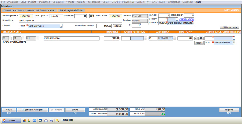 Si supponga di registrare una fattura di vendita relativa al cliente Verdi Costruzioni per un totale di 2.000 €.