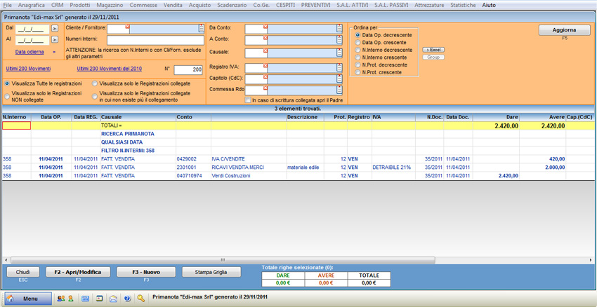 NB: se i moduli "Contabilità analitica", "Scadenzario" e la funzione che consente di collegare la contabilità analitica alla contabilità generale sono abilitati, queste scritture vengono effettuate in automatico (vedere sezione "Collegamento tra Contabilità Analitica e Contabilità Generale").