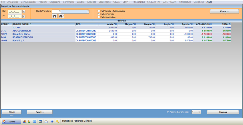 Premere il pulsante “Cerca” o il taso F5 al fine di visualizzare le statistiche desiderate. Ogni riga rappresenta un cliente/fornitore, del quale viene specificato il codice, il nome, la tipologia (cliente, fornitore, cliente/fornitore), il fatturato suddiviso nei vari mesi e il fatturato annuale.
