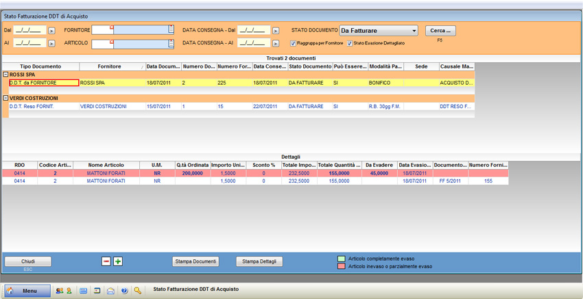 NB: le linee evidenziate di rosso indicano articoli inevasi o parzialmente evasi, mentre le linee evidenziate di verde indicano articoli completamente evasi.
