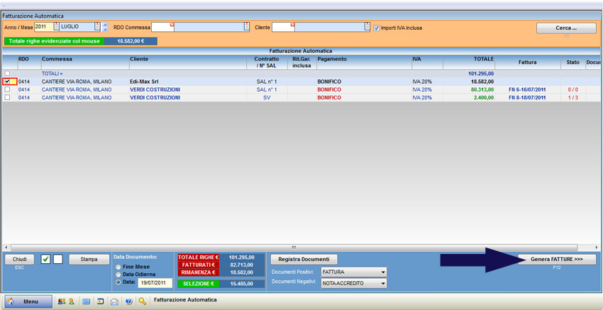 Viene proposto l’elenco dei S.A.L. da fatturare: selezionare quello desiderato tramite la spunta del relativo checkbox e premere il pulsante “Genera Fatture” nella parte inferiore della schermata.