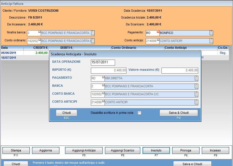Viene proposta la schermata dell'anticipo fattura: premere il pulsante "Insoluto".