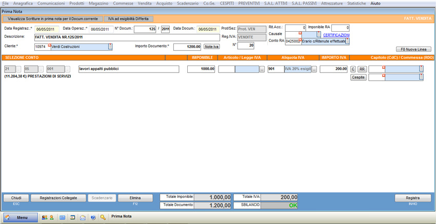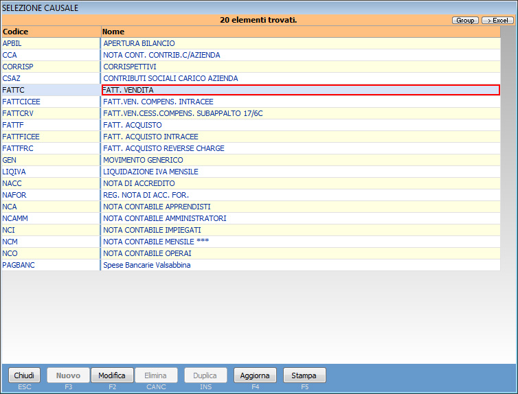 Viene proposto l’elenco delle causali contabili: selezionare la causale relativa alla fattura di vendita (FATTURA DI VENDITA).