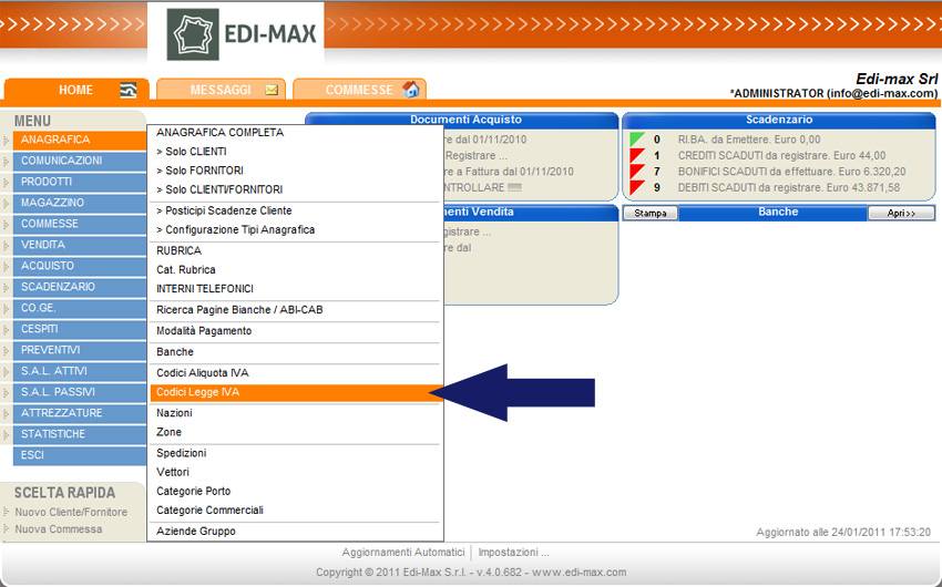 Il primo passo consiste nella creaione dell'aliquota Iva relativa a questo tipo di operazione; dal menu principale selezionare "Co.Ge." e "Codici Aliquota Iva".