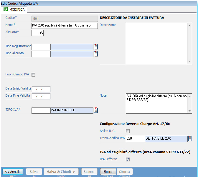 All'interno dell'elenco dei codici aliquota Iva premere il pulsante "Nuovo" e compilare i campi necessari a caratterizzare l'aliquota: