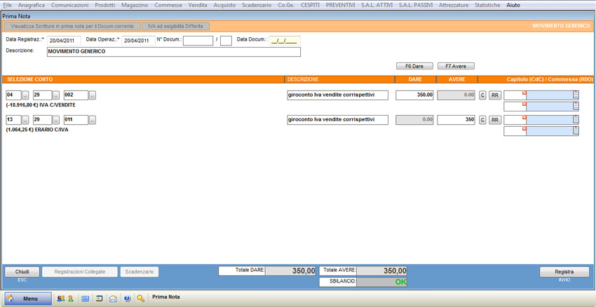 Per registrare le scritture relative al giroconto Iva vendite corrispettivi, seguire la procedura sopra descritta inserendo conti e contropartite opportuni.