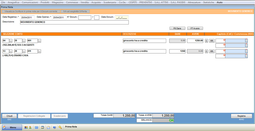 Per registrare le scritture relative al giroconto Iva ventilata, seguire la procedura sopra descritta inserendo conti e contropartite opportuni.