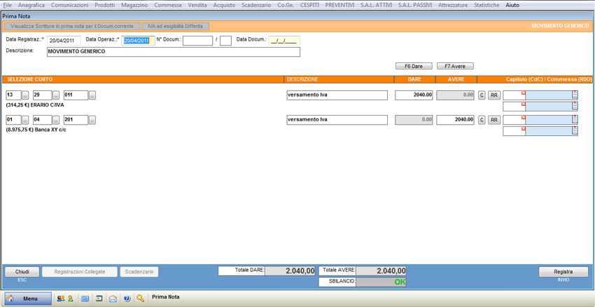 Per registrare le scritture relative al versamento dell'Iva, seguire la procedura sopra descritta inserendo conti e contropartite opportune.