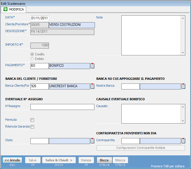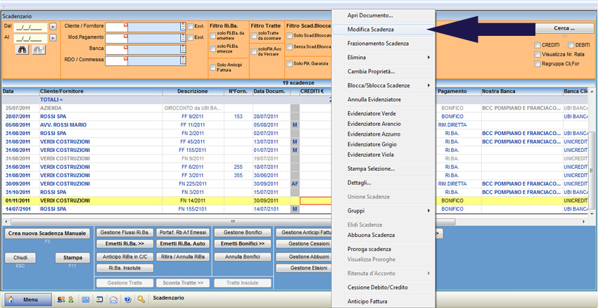 La funzione “Modifica Scadenza” consente di modificare alcuni dati caratterizzanti la scadenza (data, modalità di pagamento, banca, etc.).