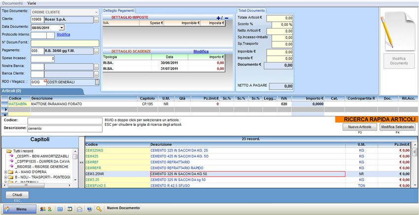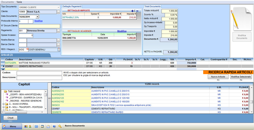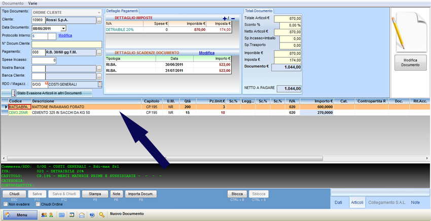 Nel caso in cui si debbano inserire nell'ordine degli articoli presenti all'interno dell'elenco è necessario posizionarsi all'interno del campo "Descrizione" e premere il tasto F1 e selezionare l'articolo da inserire nel documento. Il software riporta nella griglia dell'ordine tutti i campi presenti all'interno dell'anagrafica; procedere poi a compilare i campi mancanti, quali ad esempio l'unità di misura, la quantità, il prezzo unitario, gli sconti in percentuale, l'aliquota Iva. Se l'articolo richiesto non è presente nell'elenco, è possibile crearlo premendo il pulsante "Nuovo Articolo" e compilando tutti i campi necessari.