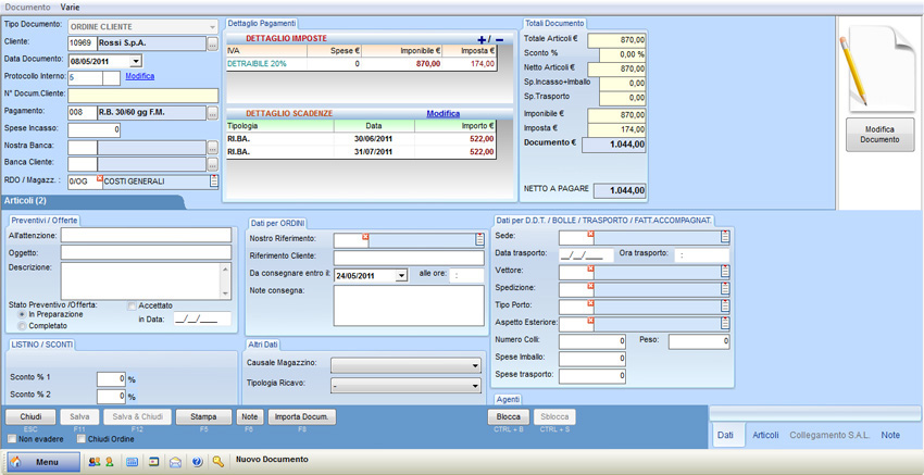 Per salvare l’ordine inserito è necessario confermare il documento premendo il pulsante “Salva & Chiudi” o il tasto F12; dopo aver salvato il documento, il programma esegue un controllo di validità dei dati inseriti informando l’utente degli eventuali errori mediante un avviso testuale ed evidenziando di colore rosa i campi incompleti; se il controllo ha avuto esito positivo il software assegna al documento un numero di protocollo progressivo ed univoco.
