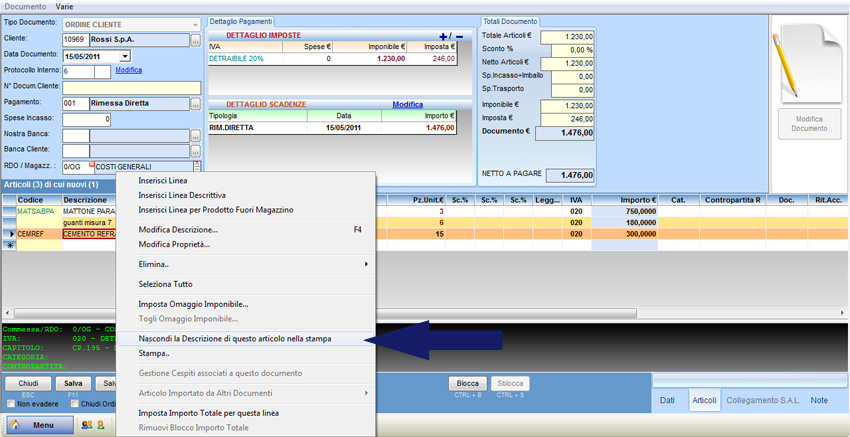 Nel caso in cui si debba nascondere la descrizione di un articolo nella stampa del documento, è necessario posizionarsi all'interno del campo "Descrizione" in corrispondenza della riga dell'articolo, cliccare col tasto destro del mouse e selezionare "Nascondi la descrizione di questo articolo nella stampa": in questo modo nella stampa dell'ordine non compare la descrizione dell'articolo selezionato.