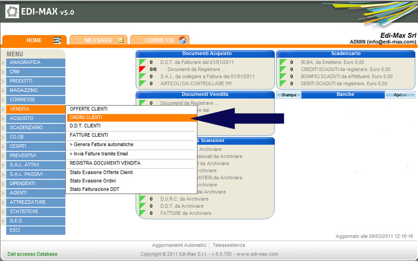 Per inserire un ordine cliente dal menu principale selezionare la voce “Vendita” e “Ordini Clienti”. Viene visualizzato l’elenco degli ordini precedentemente inseriti; per crearne uno nuovo, premere il pulsante “Nuovo” o il tasto F3.