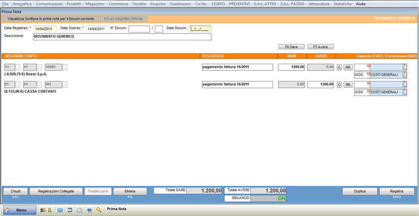 NB: se i moduli "Contabilità analitica" e "Scadenzario" sono abilitati, queste scritture vengono effettuate in automatico.