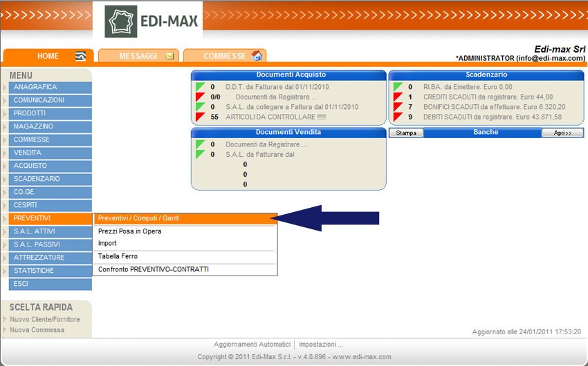 Per creare un nuovo preventivo, dal menu principale selezionare la voce “Preventivi” e “Preventivi/Computi/Gantt”; viene visualizzato l’elenco dei preventivi precedentemente inseriti; per crearne uno nuovo, premere il pulsante “Nuovo” o il tasto F3.