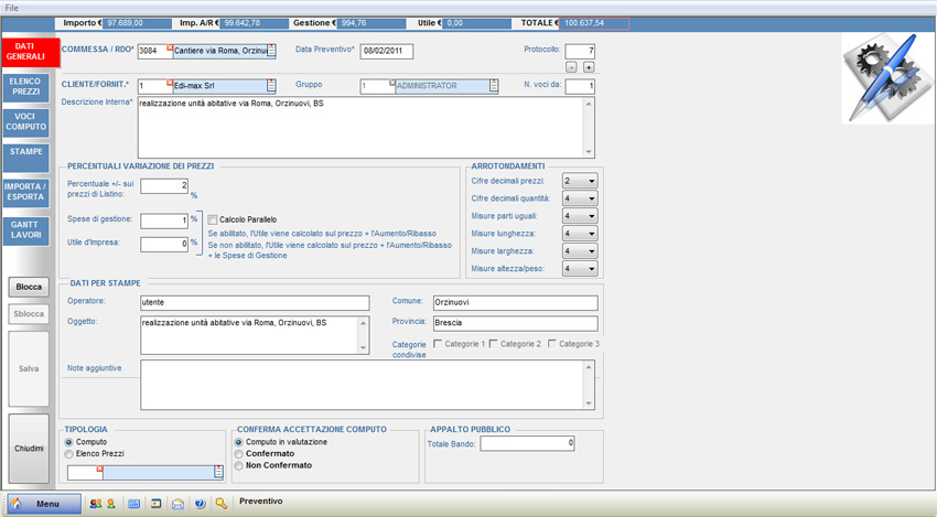 Il software calcola e propone, sia il totale di ogni singola componente, che della voce stessa, proponendone un riepilogo completo di dati come l’aumento o il ribasso dei prezzi inseriti, i costi di gestione e l’utile.
