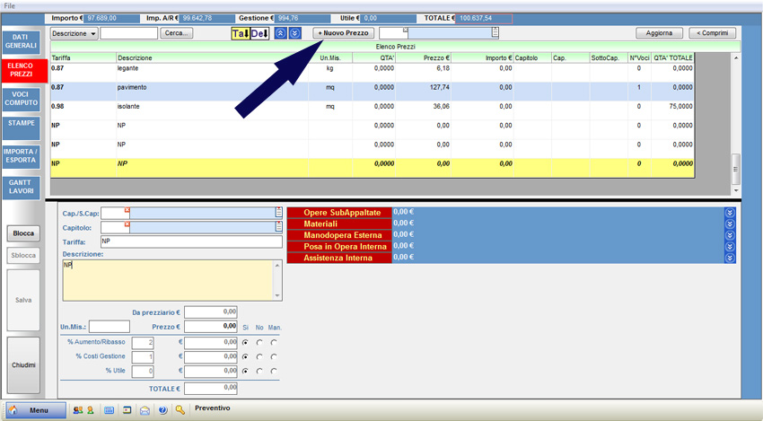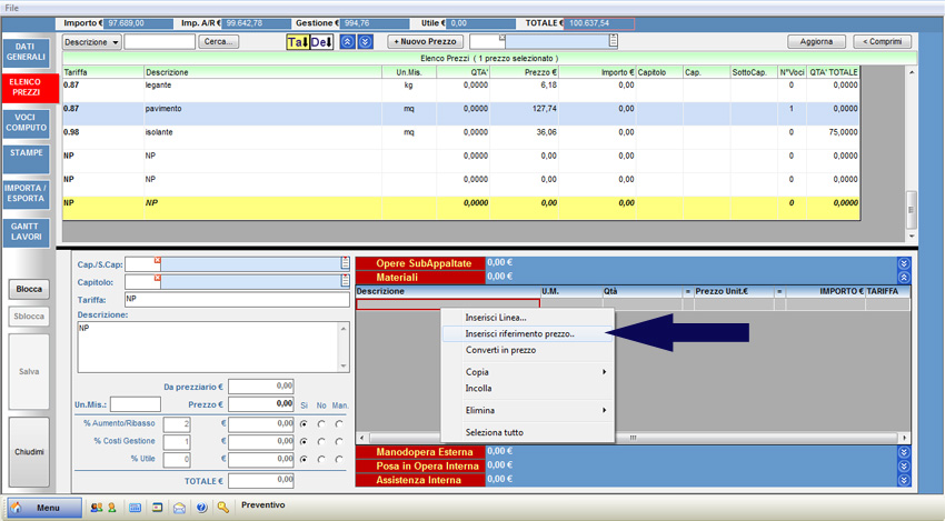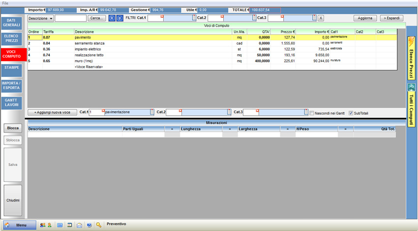 Il software calcola e propone automaticamente il totale della voce ed il totale del preventivo.
