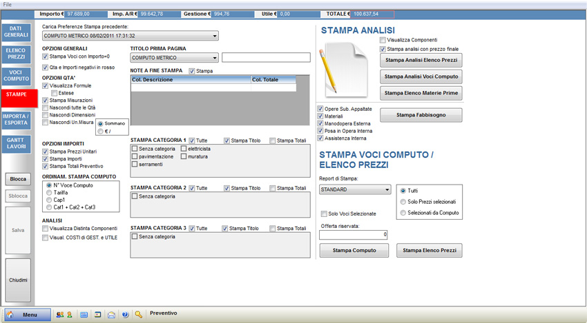 Per effettuare la stampa del preventivo creato si seleziona dal menu la sezione “Stampe”. Mediante la spunta dei vari checkbox è possibile definire quali dati devono comparire nella stampa e impostare le diverse opzioni relative a dati generali, quantità, importi, ordinamento di stampa, analisi.