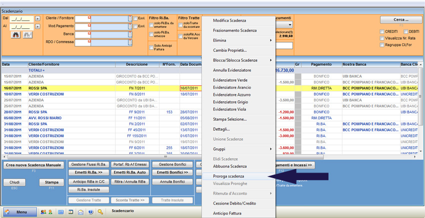 Dal menu principale selezionare “Scadenzario” e “Scadenzario Pagamenti”: visualizzare l’elenco delle scadenze (vedere sezione "Visualizzazione Scadenze") e selezionare la scadenza che si intende prorogare, cliccando col tasto destro del mouse; selezionare “Proroga Scadenza”.